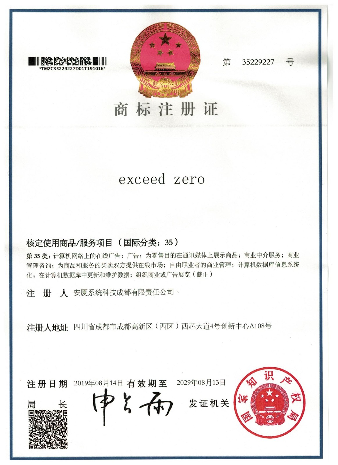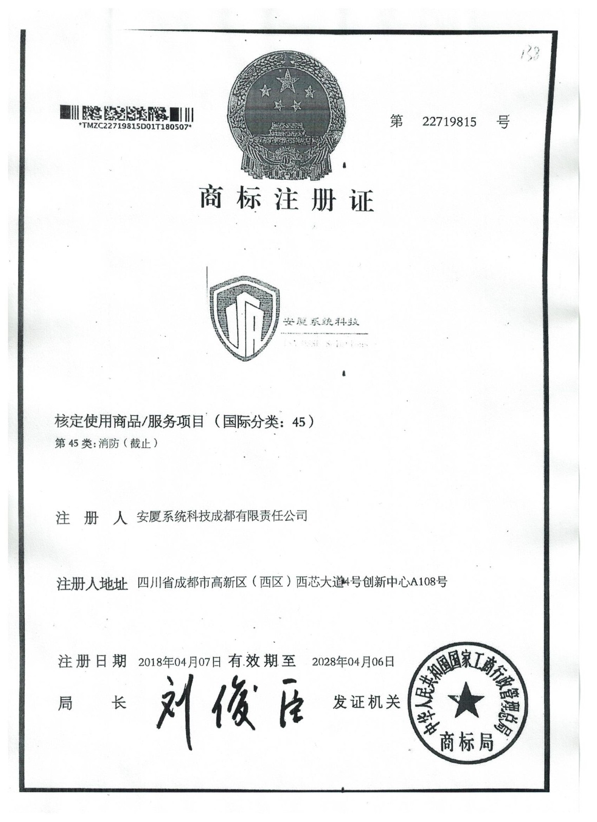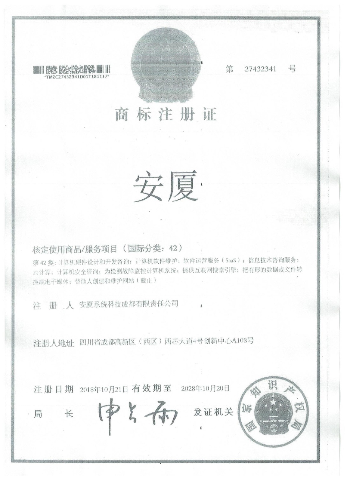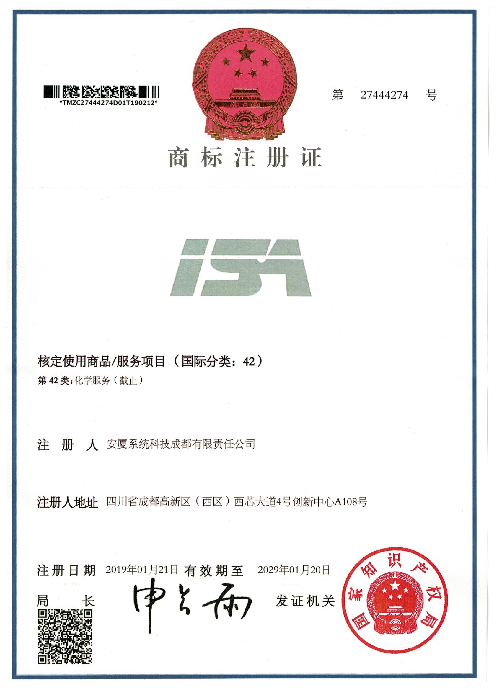 • 商標注冊證