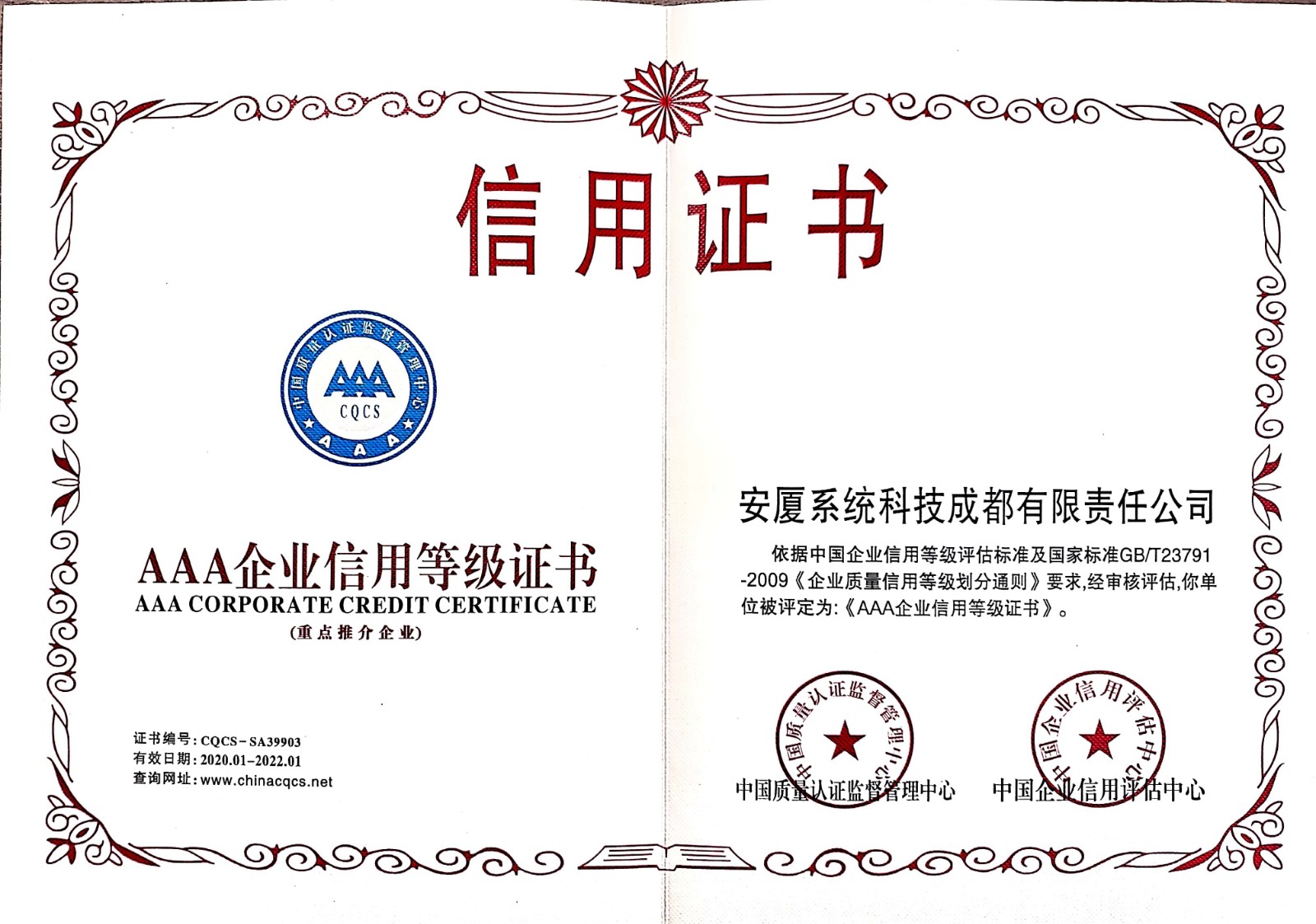 • 3A企業等級認證證書