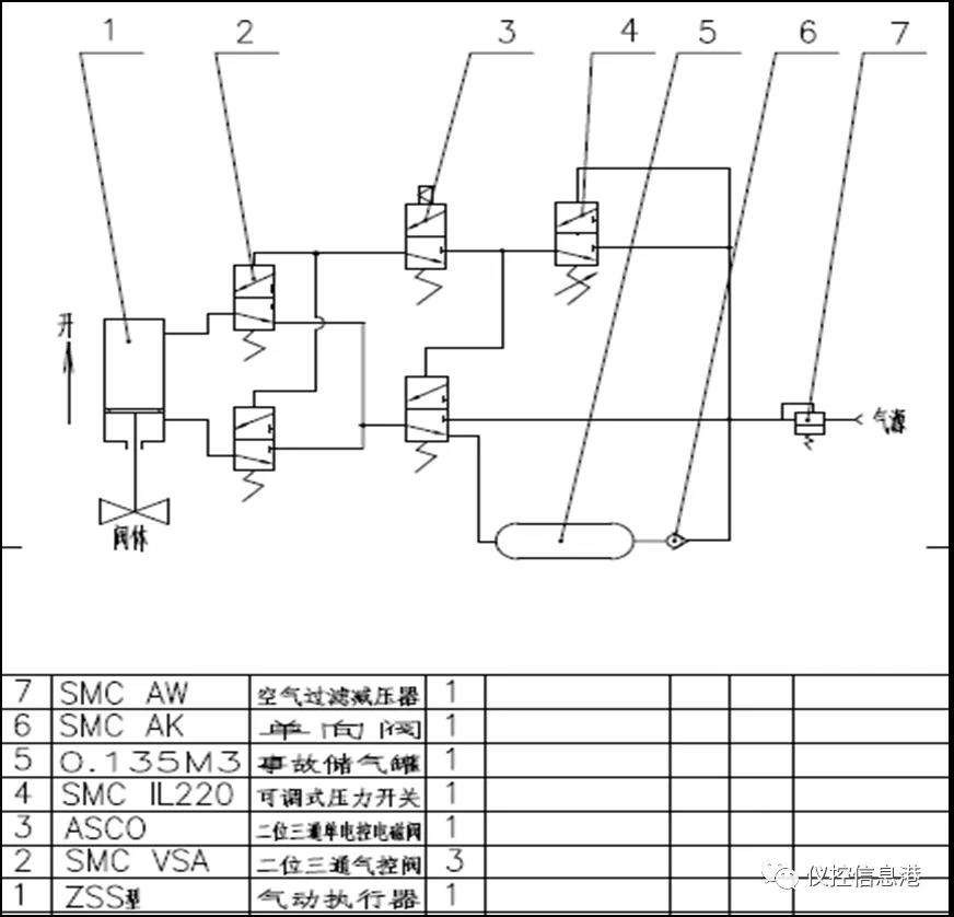 是不是這種閥門最好呢?也不一定。這種結構的閥門最大的弊端是,不好判斷彈簧作用力的可靠性,當聯鎖需要緊急啟動,而動力風又中斷的緊急狀態下,彈簧如果乏力,那閥門會無法關閉或者打開。而彈簧是否可靠,在正常聯鎖測試中不好判斷。 常見切斷閥的結構就這三種模式,了解這三種氣缸結構就了解閥門的故障狀態了嗎?這還遠遠不夠。氣缸的動作模式完全由外部氣動元件來控制,而氣控元件的組合根據聯鎖的需要千變萬化。舉幾個簡單的例子: 1、單缸單作用在動力風中斷時一定會關閉或者打開嗎? 大部分聯鎖閥門在動力風中斷時要求關閉或者打開,但是聯鎖的設計一定是可用性和可靠性的綜合考慮。在考慮安全性的同時一定會考慮可用性,且有時候的動力風中斷并非全部中斷,而是局部動力風管線的受損。關閉某個切斷閥會造成較大的經濟損失或者給生產帶來次生安全風險。這種情況下,一般閥門上會帶有鎖止閥,其作用就是當動力風壓力降到一定的設定值時,切斷動力風,氣缸中的壓力始終推動彈簧使得閥門保持原有狀態。加上鎖止閥就變為FL。什么情況下用到這種閥呢,比如大型的氣體凈化項目,當下游生產裝置發生故障時,需要緊急切斷上游供料閥門,下游裝置全部停工,可能會造成幾千萬的經濟損失。但是動力風暫時故障,能在短時間恢復,倒不如設置成FLC。
