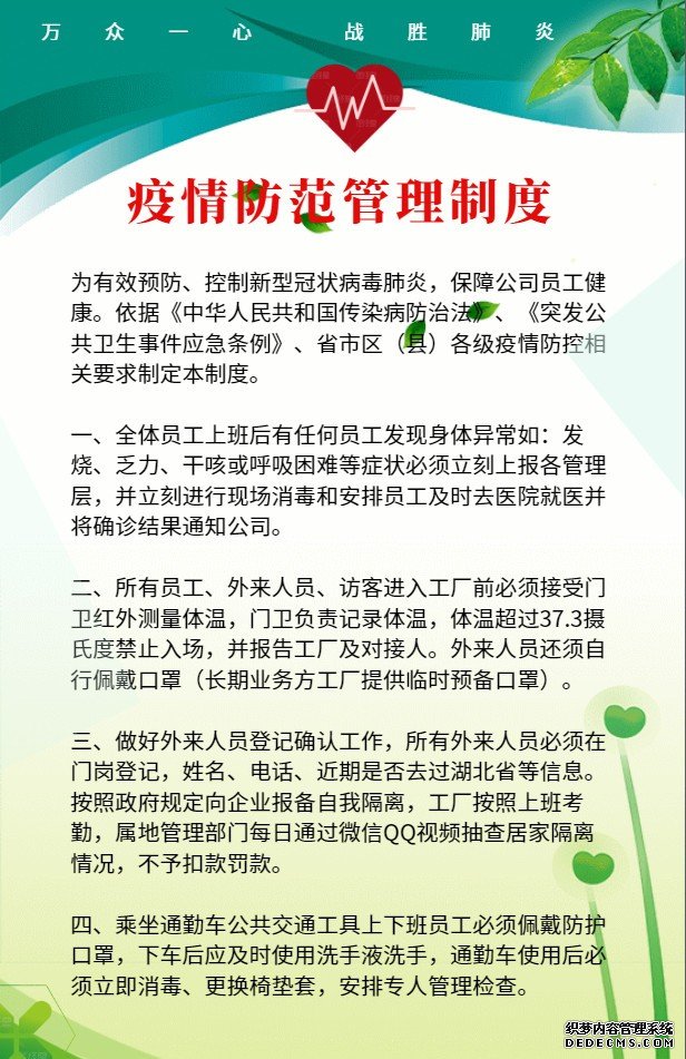 當前,新型冠狀病毒感染的肺炎疫情嚴重威脅人民群眾身體健康和生命安全,特別是節后工業企業陸續復工復產,容易形成人員集聚,疫情防控形勢緊迫,責任重大。企業必須做好節后復工復產疫情防控工作。