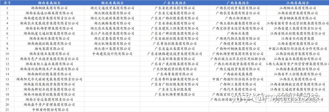 湖南、湖北、廣東、廣西及江西,這5個省份及省級行政區(qū),共設(shè)立了87家省屬國企。其中湖南省21家、廣東省18家、廣西省19家、江西省19家。