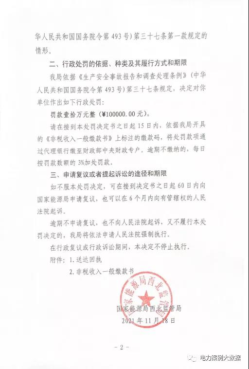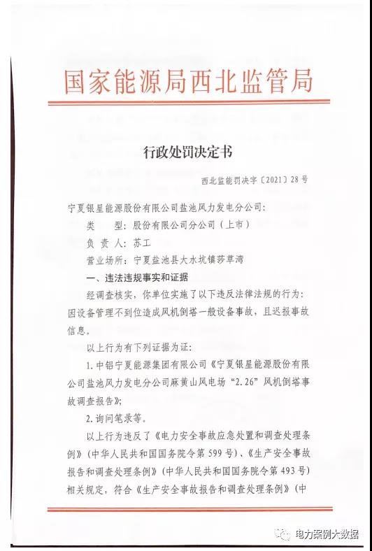 近日,國家能源局西北監管局發布【2021】28號行政處罰決定書,因設備管理不到位造成風機倒塔一般設備事故,且遲報事故信息,對寧夏銀星能源股份有限公司鹽池風力發電分公司罰款10萬元。