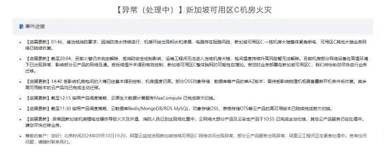 火災(zāi)公告顯示,11日凌晨01:46,接當(dāng)?shù)叵酪螅蛳罎菜掷m(xù)進(jìn)行,機(jī)房開始出現(xiàn)積水和滲漏,電路存在短路風(fēng)險(xiǎn),新加坡可用區(qū)C一棟?rùn)C(jī)房大樓整體緊急斷電,可用區(qū)C其他大樓業(yè)務(wù)網(wǎng)絡(luò)已陸續(xù)恢復(fù)。